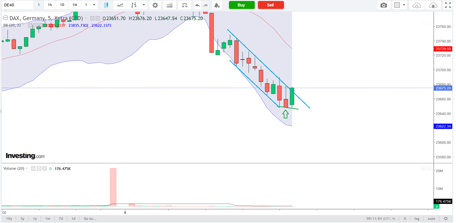 https://www.investing.com/indices/germany-30-chart m5-ön már dupla alj van 23666. általában az ilyen "dupla alj" alá néha még jön egy lerottyanás, -20-40 pont, majd onnan áll talpra, és jön a long fordulat. vagy ha nem jön, akkor +2-3 ponttal magasabb m5-ről már emelkedik (m1-en látható az oka) Figyeld meg mit írtam!