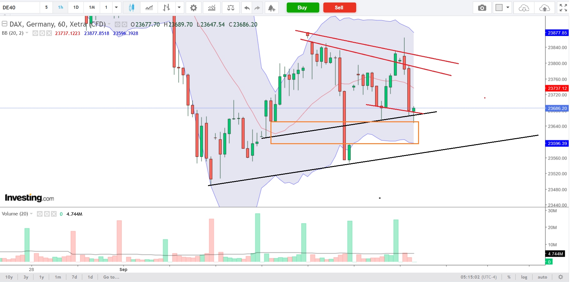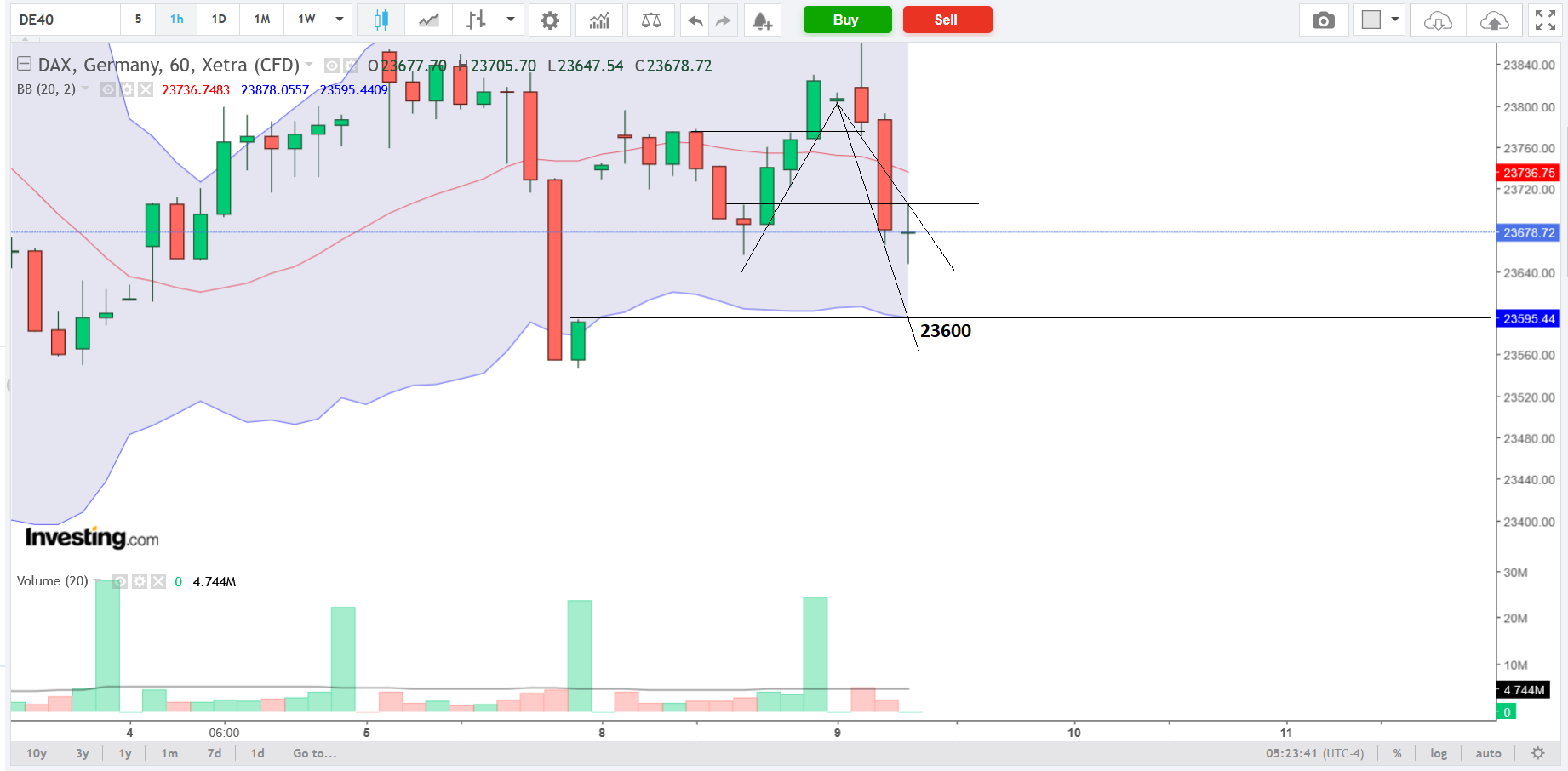 lentebb írtma: https://www.investing.com/indices/germany-30-chart 23660 23600, erős zónák. 23660-at elérte. ez a tegnapi alj, ezért erős, "dupla alj" napos. 4h közép emelkedő volt, ha visszajönne fölé, akkor lenne értelme. 23666, 4h-n a 09.03-09.04 testek érintkezése, váltója, eddig ez visszateszt. ha esik tovább, akkor jön a GAP töltés 23600