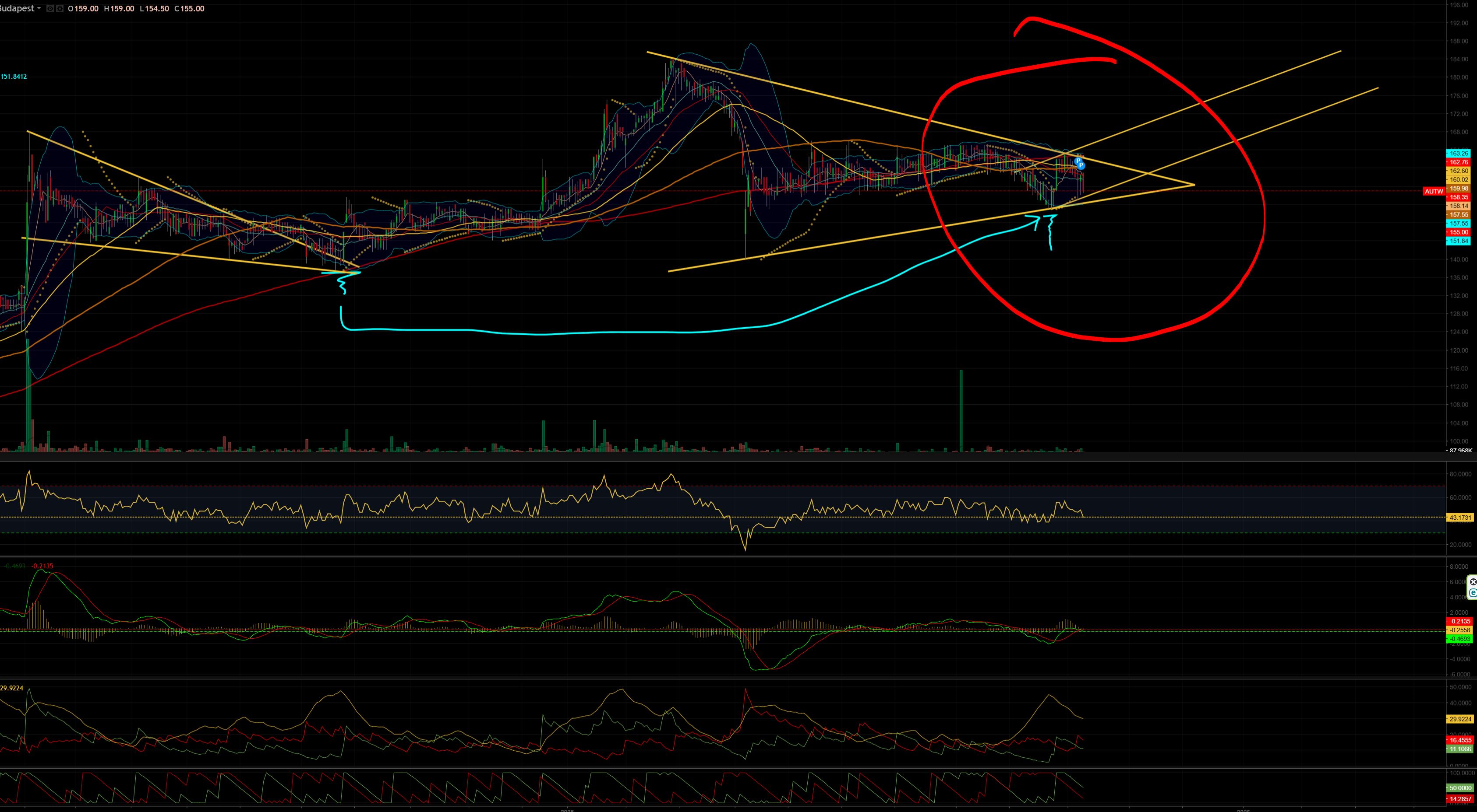 -AutoWallis.-Be van szűkülve a görbe, alul a 150-es szint, míg felül a 163-as szint fogja közre. A szűkülésből néhány héten belül ki kell menjen. Újabb long jelzés majd a piros vastag trendvonal fölé kerülés után kereshető. A vastag zöld sérülése hosszú időre csökkenő trendet okozhatna. A két hete látott 150-ről történt pattanás biztató, rövid távon long esélyt készíthet elő. Ellenállások: 175; 187,5. Támaszok: 150; 137,5.