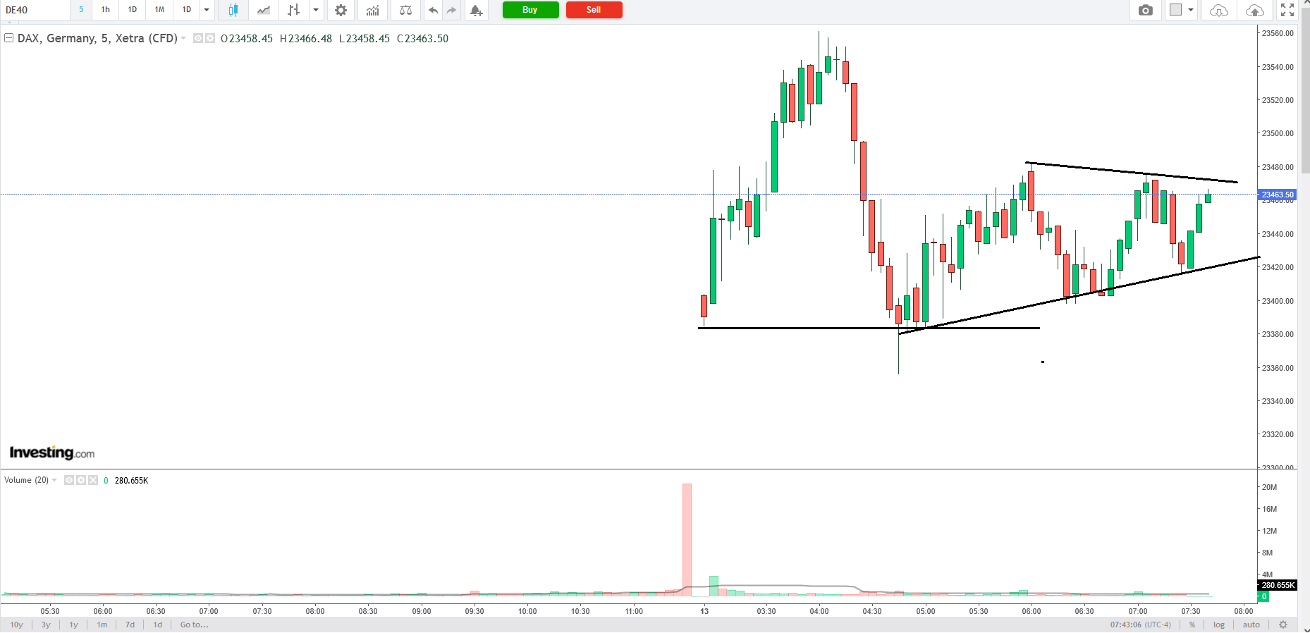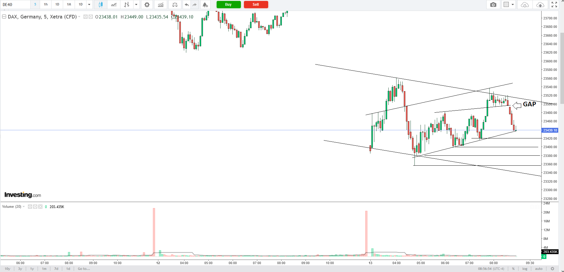 https://www.investing.com/indices/germany-30-chart 1h-ra rakd át. 05.23. Ez az EU vámos szir-szar nap. Ott az 1H csatlakozás 23470. 23330-23350 volt a kulcsfontossúgá, nem konkrétan a 23470, de én ezt a találkozási pontot írtam. ha 1h-n nézed, 23300 környékére "KRITIKUS" fontosságú. Ha ez elesik, akkor lehet belőle nagyobb rotty, védeni fogják, erre tippelek. Főleg 2 GAP van. a Mait beszántanám zöld festékkel, ha érted a célzást.