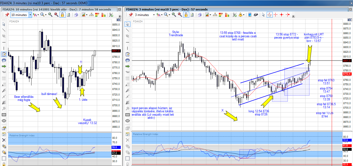 Ha a kérdés a DEMO feliratra irányult, az azért van, mert nem az éles számlámon dolgoztam. FDAX-ban kb 500 EUR kockázatot kellene vállalni egy belépés esetében, azaz 2 konti, ez nekem magas. DOW minit szoktam lőni, ott ennél kisebb kockázattal lehet menni (egy pont 5 usd, 170x tőkeáttét), de ott a forgalom 15:30 után van. Tesztelem a stratégiáimat.