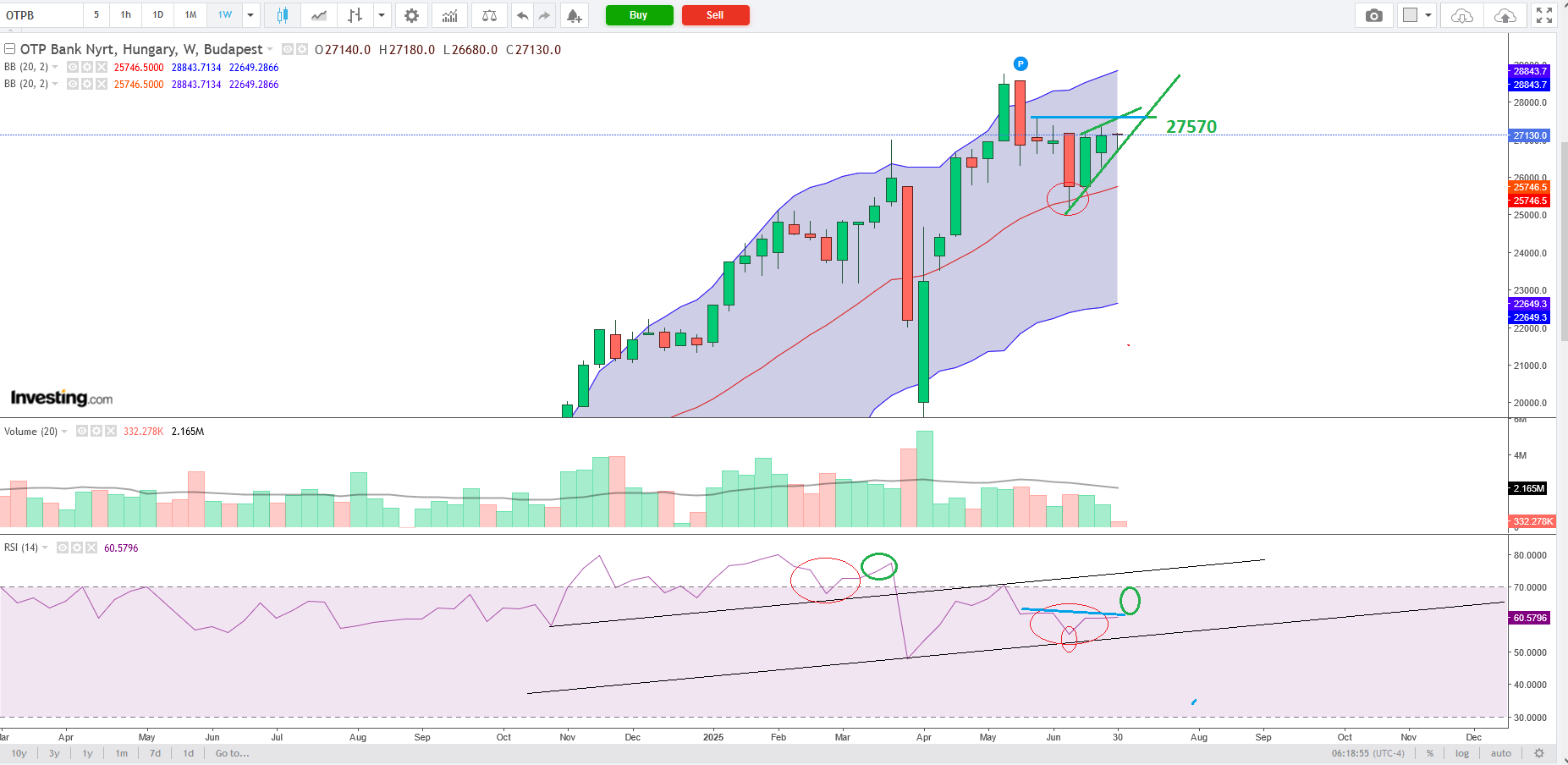 "Nem zár 27100 alatt". Túl sok a remegő kezű. A többséget el kell bizonytalanítani, hogy kiszálljanak. Amikor a bizonytalankodók kiszállnak: LONG. És amint észreveszik, hogy rakéta van, teljesen feleslegesen dobták, bármi áron, bármikor longba visszaállnak. FOMO. A napos bollinger közép felett oldalaz. RSI rásimulva a 54-re, longhatárnak tűnik. 4h közép felett is van, de nem tolja még, szimplán vízszintes a csatorna. Hetes talán a legérdekesebb. 4db emelkedő alj. Ráfeszülve mind a 27100-as zónára. Az előző 2 hetes emelkedő alj tető, a mostani? Adná a logika, hogy emelkedő tetőt csináljon. Ennek a határa és összehúzva a tetőket 27570. Hónapos nem zárt 27100 felett, már csak ezért is nagy ellenállás. Hónapos RSI még mindig ~82
