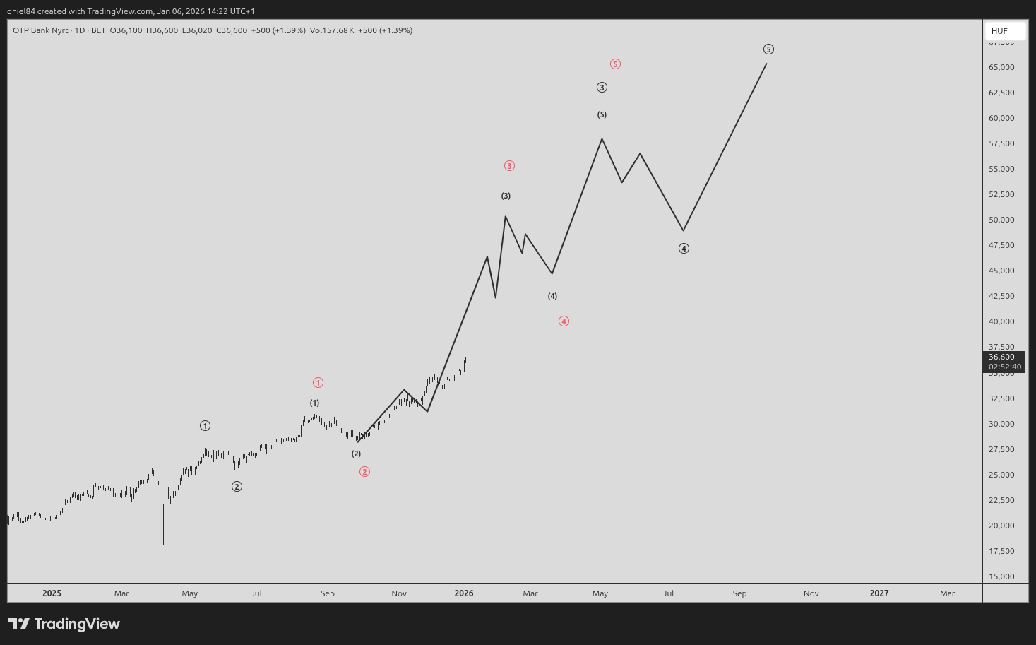 Tegyük fel mind az indikátorokon mind a csatorna felső vopnalán áttör az OTP akkor ha elliotti megközelítést alkalmazunk egy nyujtott 5 dik hullám indulhat igen meredek pályán felfele.... A másik megoldás hogy hamarossan durván lefordul az ár... Szoval a térkép most egy elágazást mutat ahol minden bizonnyal konszenzus fog születni arrol hogy merre és abba a z irányab durván fog haladni az ár nem 500 meg 1000 pontot hanem többet... csak azt kel meglátni merre milyen mozgás lehet esedékes mert most éppen az van ha elindul felfele akkor egy mániás év is jöhet...